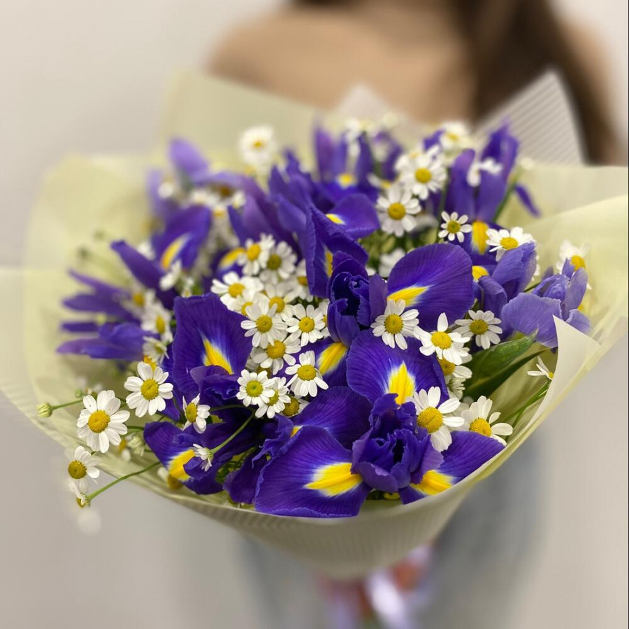 На фото букет «луговая сказка». В составе: ирис 5 шт, танацетум 4 шт, дизайнерская упаковка 1 шт, атласная лента 1 шт, . Все цветы свежие и ароматные, букет красиво оформлен и отлично подходит для подарка. Доступна доставка цветов или самовывоз.