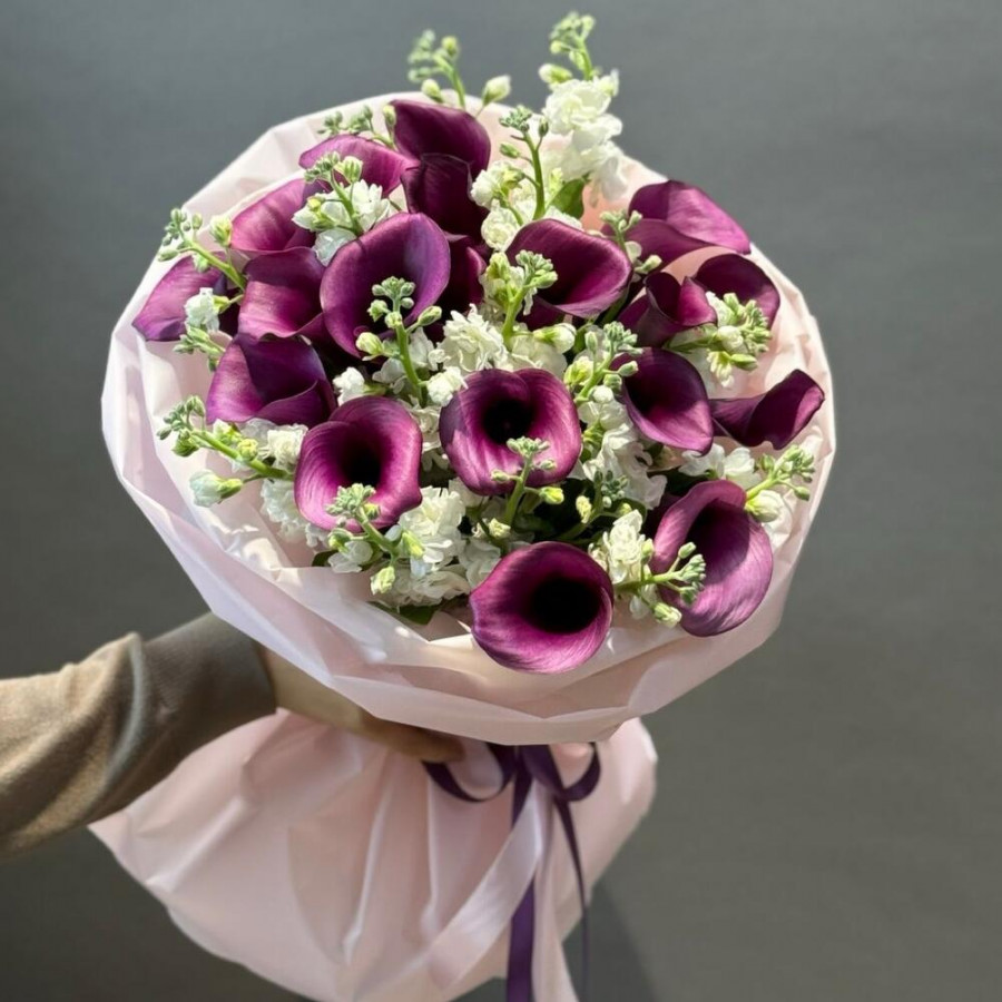 На фото букет «тайна полуночи». В составе: калла 20 шт, маттиола 5 шт, дизайнерская упаковка 1 шт, атласная лента 1 шт, . Все цветы свежие и ароматные, букет красиво оформлен и отлично подходит для подарка. Доступна доставка цветов или самовывоз.